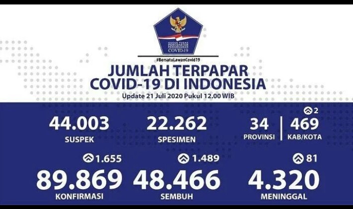 Selasa (21/07/20) Penambahan 1.655 orang konfirmasi kasus positif virus corona di Indonesia.