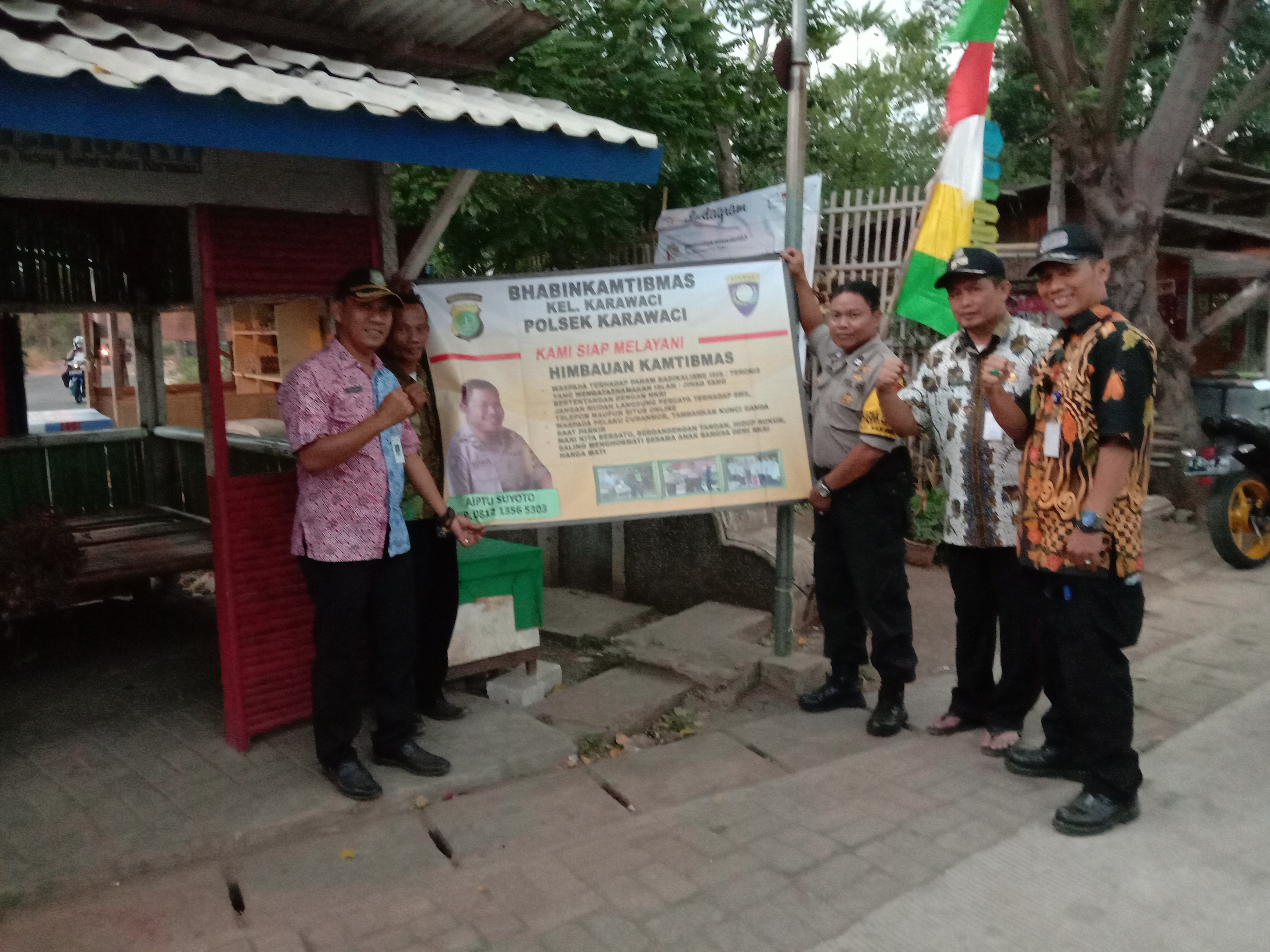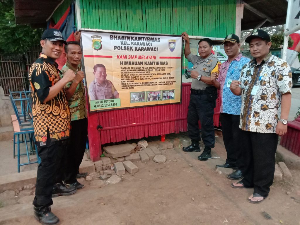 Aiptu Suyoto bersama lurah Karawaci Asep Darwis Supardi SE, Sekel Taufik Hidayat serta ketua rw 03 Ardali melaksanakan pemasangan spanduk himbauan kamtibmas di Pos Kamling rw 03, Kel. Karawaci, Kec.Karawaci Kota Tangerang.