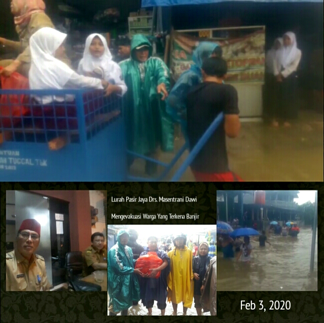 Lurah Pasir Jaya Drs. Masentrani Dawi, M. Si meninjau langsung lokasi banjir, membantu mengevakuasi warga yang melintasi genangan air, serta memberikan bantuan berupa makanan, Senin (03/02/2020).