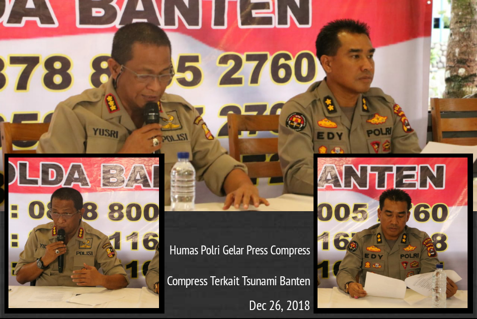 PANDEGLANG | indotvnews.co.id – Divisi Humas Polri bersama Bidhumas Polda Banten menggelar kegiatan Press Compress terkait bencana Tsunami Selat Sunda di posko media center Hotel Wira Carita, Rabu (26/12/2018) petang bekisar pukul 17.00 WIB