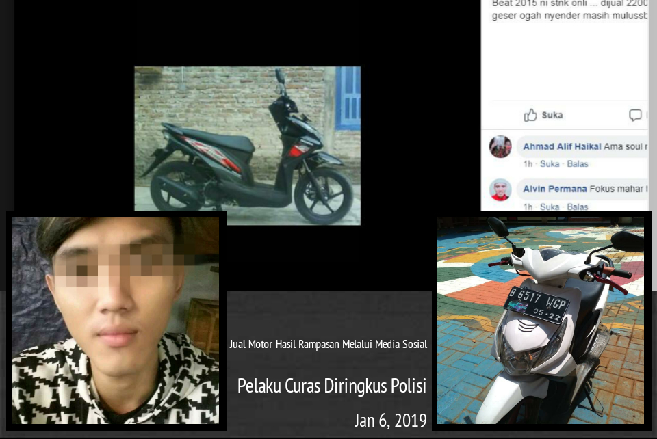 Sementara Kanit Reskrim Polsek Kembangan Iptu Dimitri Mahendra SIK MSi mengatakan, pada keesokan harinya, diketahui sepeda motor korban dijual secara online melalui facebook dengan akun group Info Balap Liar Serpong dengan harga Rp 1.800.000,- dan untuk transaksi dilakukan di daerah Jombang Tangerang Selatan.
