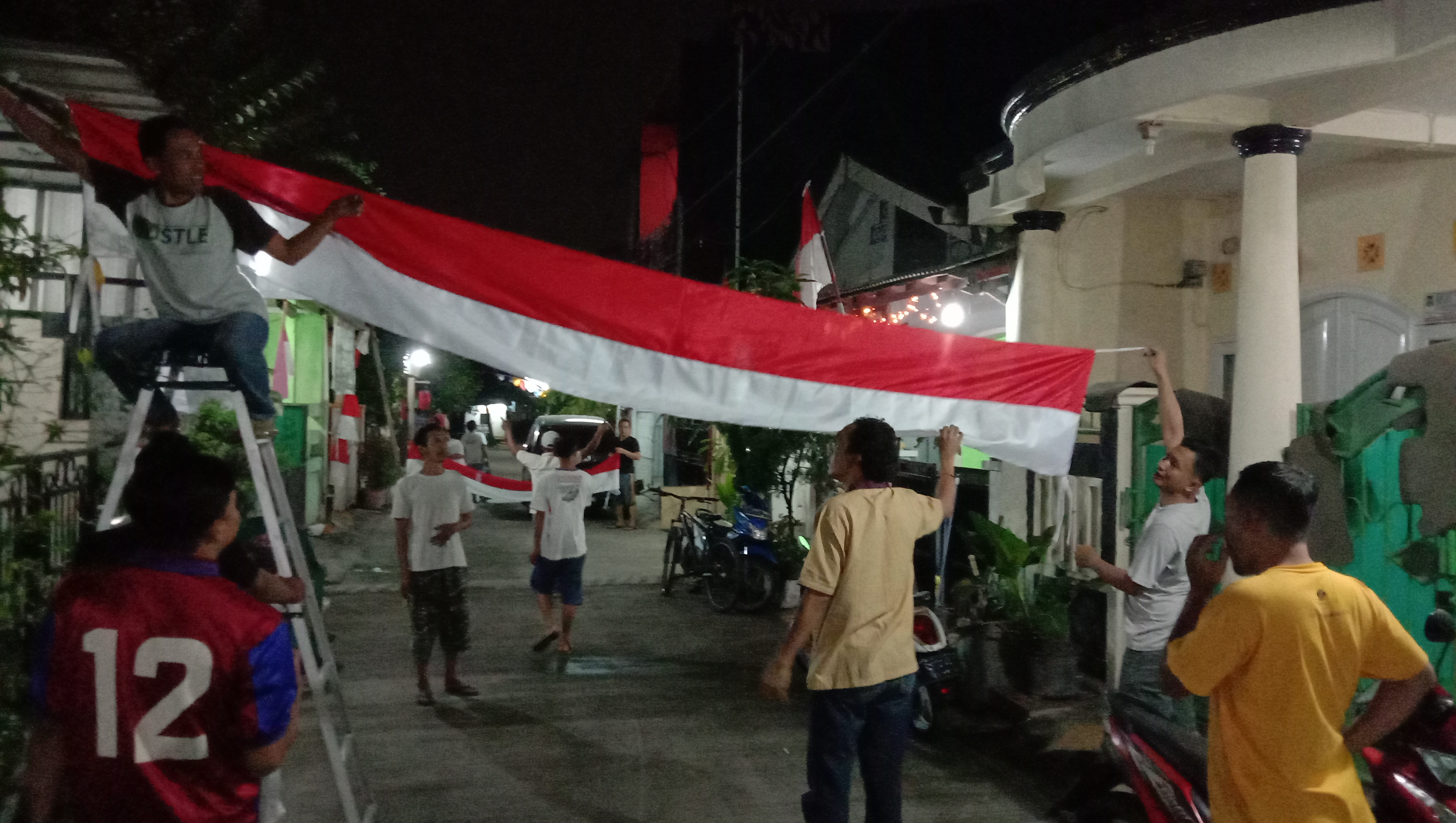 Kusnadi salah satu warga menuturkan pemasangan bendera serentak sudah menjadi tradisi di sini”.terangnya kepada media saat setelah memasangkan bendera.