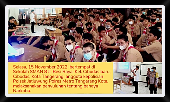 Selasa, 15 November 2022, bertempat di Sekolah SMAN 8 Jl. Besi Raya, Kel. Cibodas baru, Cibodas, Kota Tangerang, anggota kepolisian Polsek Jatiuwung Polres Metro Tangerang Kota, melaksanakan penyuluhan tentang bahaya Narkoba.