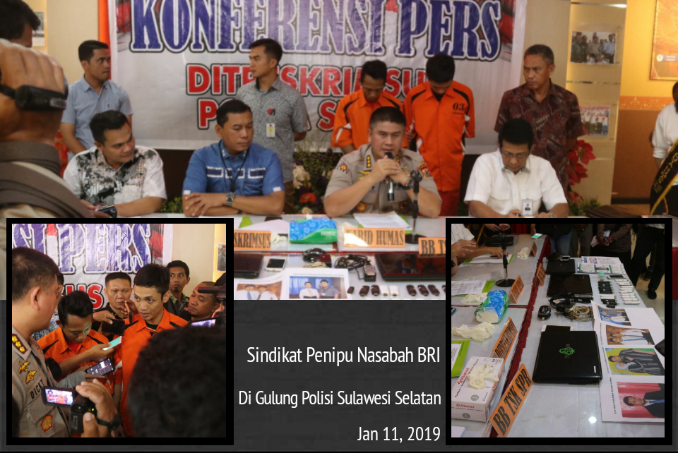“Berdasarkan analisa BRI transaksi yang dilakukan mayoritas di lakukan di wilayah Sulawesi Selatan, maka berdasarkan hasil analisa tersebut pihak BRI membuat laporan ke Polda Sulsel guna dilakukan penyidikan lebih lanjut untuk mengungkap pelaku penipuan yang telah merugikan masyarakat banyak,” Ungkap Kabid Humas Polda Sulsel Kombes Pol Dicky Sondani SIK. MH di dampingi Dir krimus Polda Sulsel Kombes Pol Yudhiawan dalam konferensi pers. Jum’at (11/01/19)